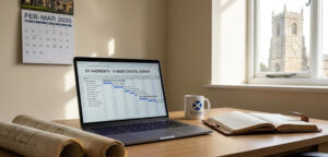 As part of our 8-week work sprint, we are currently assessing the structural integrity of the clerestory’s external masonry. High-level inspections are essential to prevent water ingress and to ensure that the lead-light windows remain secure within their stone channels. This technical oversight is part of our broader “Ecclesial Blueprint,” documenting every detail of the church’s structural evolution to guide future conservation efforts.